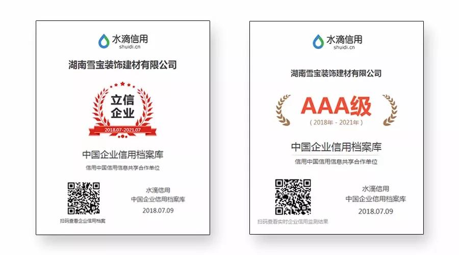 2018年7月9日,湖南雪寶裝飾建材有限公司榮獲由權(quán)威第三方評(píng)價(jià)機(jī)構(gòu)水滴信用評(píng)價(jià)中心頒發(fā)的“國(guó)家信用體系建設(shè)核心合作伙伴首批誠(chéng)信推薦企業(yè)——立信企業(yè)”和“AAA級(jí)優(yōu)秀企業(yè)信用等級(jí)證書”。