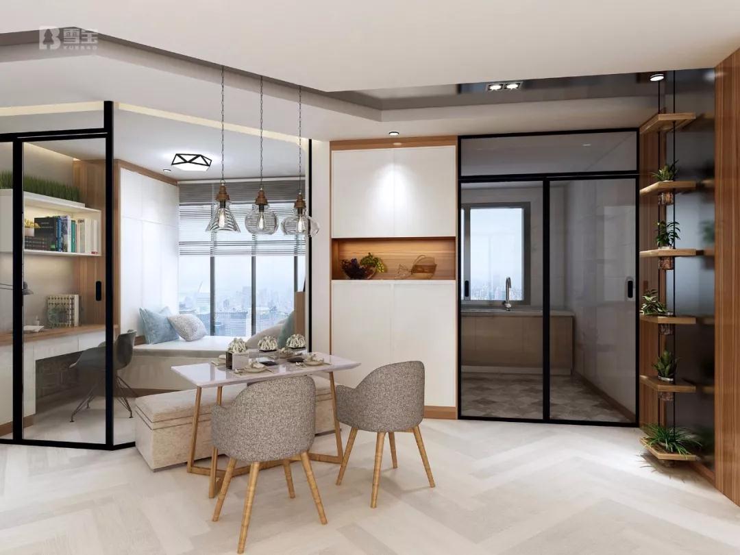 因原戶型廚房面積有限以及不大使用的開放式廚房設(shè)計(jì)可能對(duì)家居生活會(huì)造成一定弊端,設(shè)計(jì)師通過(guò)加大廚房空間并改造成封閉式廚房,充分?jǐn)U容和滿足了廚房空間功能屬性,三口之家盡享溫馨居家時(shí)光。餐廳依榻榻米智控鋼化玻璃隔斷設(shè)計(jì)擺放,空間利用恰到好處!
