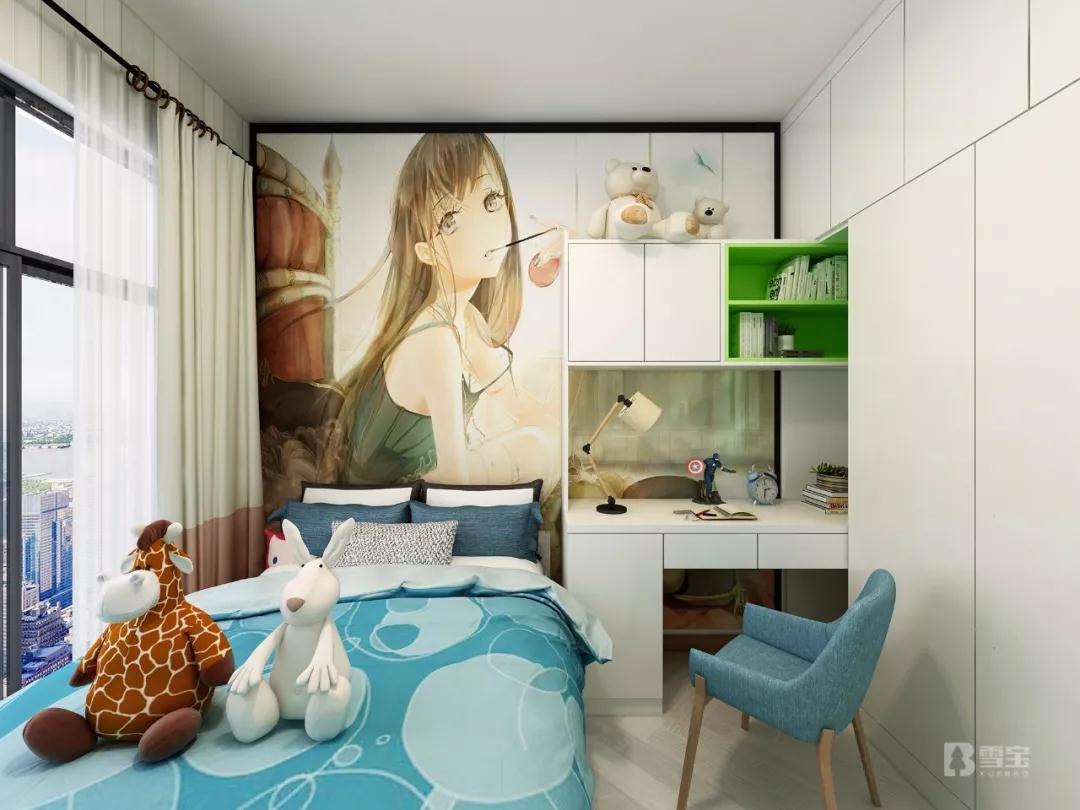 充分結(jié)合七歲孩子的喜好,墻面衣柜與書柜、書桌完美組合,收納和學(xué)習(xí)兼顧。雪寶炫彩板綠野仙蹤花色在以白色色系為主體的組合柜中脫穎而出,動(dòng)漫墻畫、卡通布偶,以及色系搭配,都讓整個(gè)空間散發(fā)出清新自然和滿滿活力感。