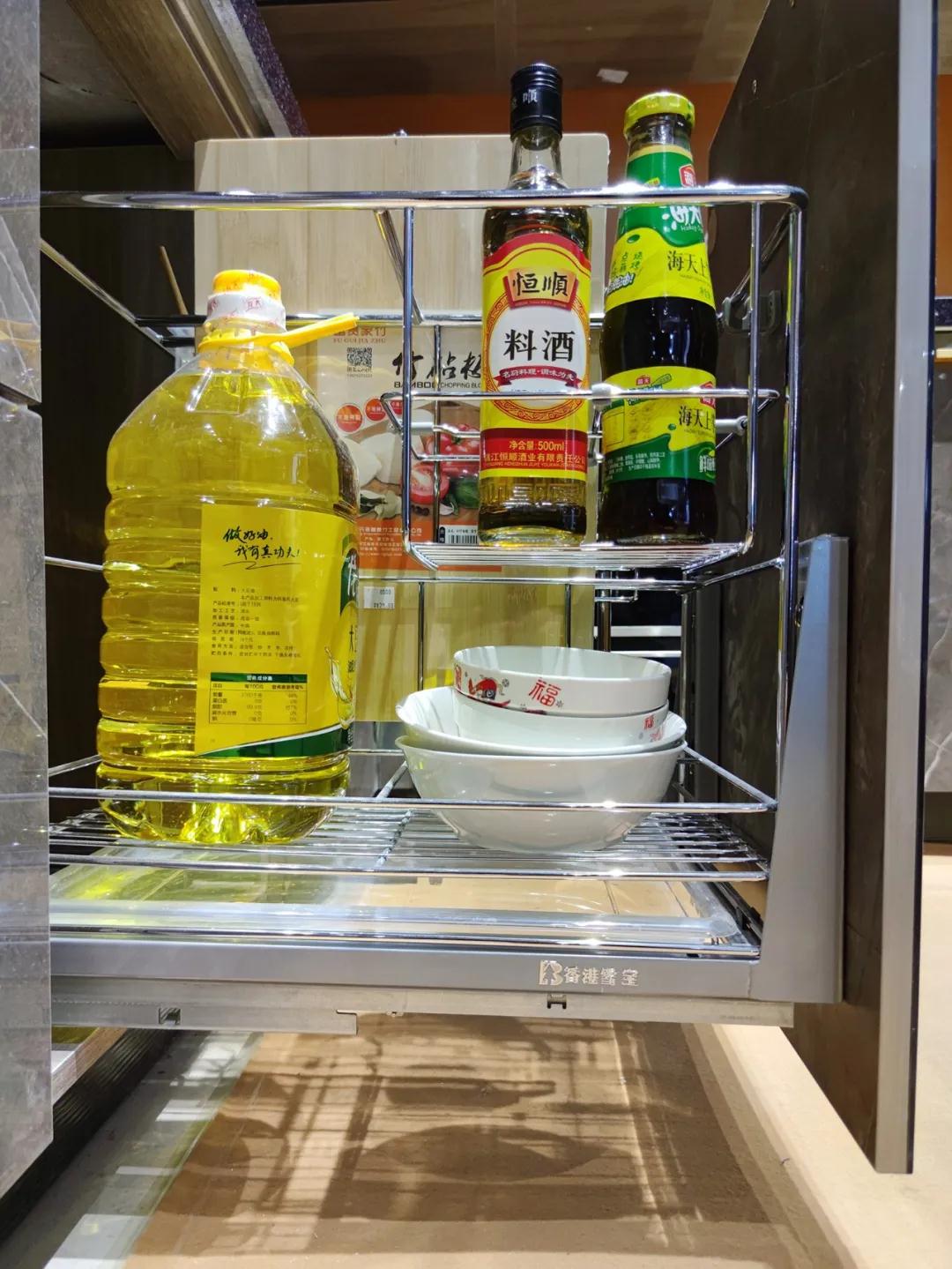 櫥柜調味籃:調味籃的作用顯而易見,就是將各種烹飪時需要使用的油鹽醬醋、辣椒、味精、生粉等等調料品收納起來,用的時候將它拉出,不用時隱藏在櫥柜里面,實用性超強大。