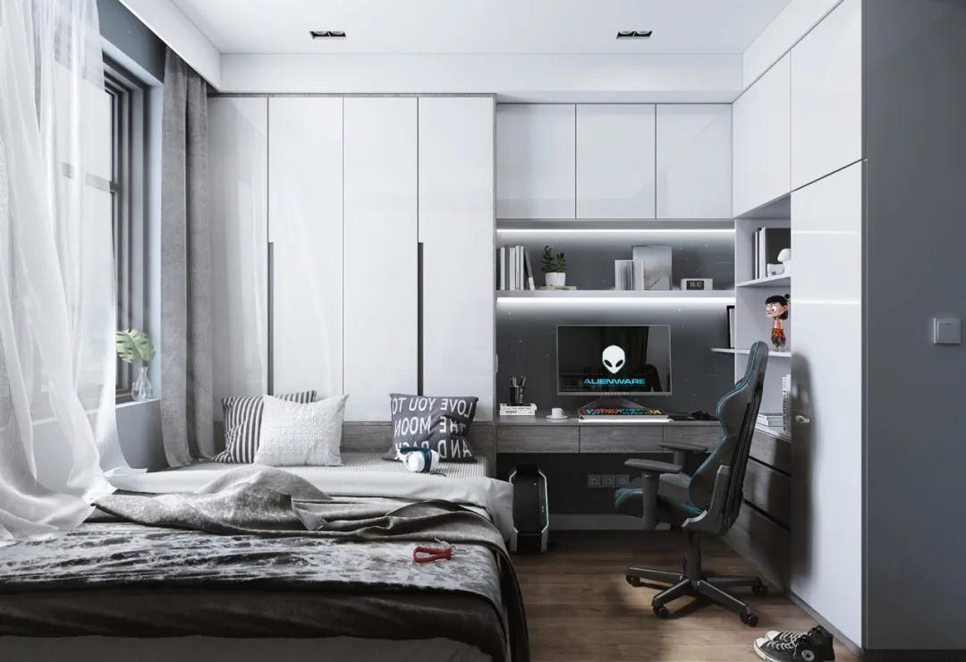 另外,書桌、柜體和床頭整體相連的設(shè)計(jì),能合理規(guī)劃布局。
