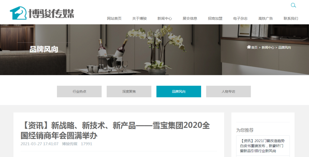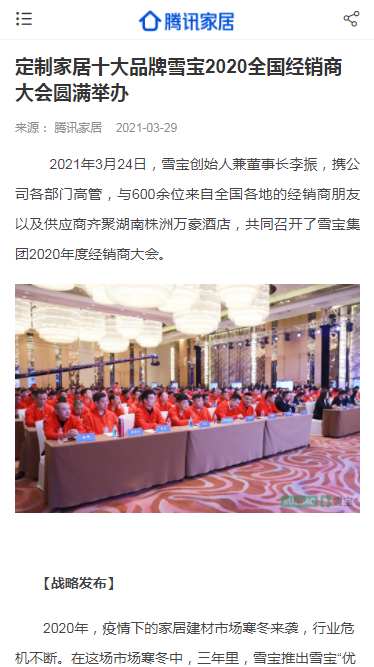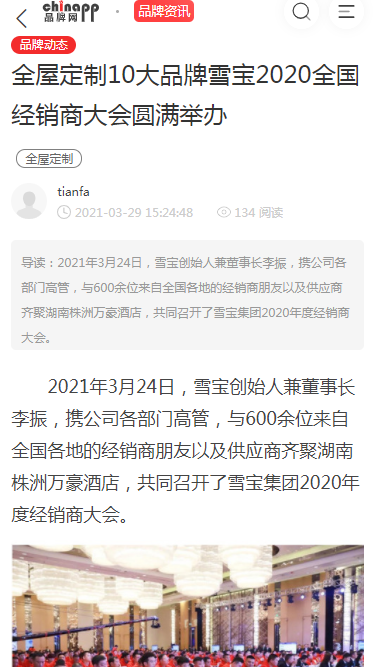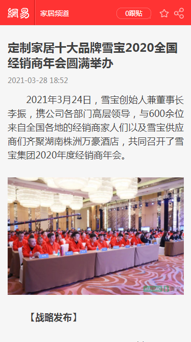 今日頭條、百度、360、新浪家居、搜狐焦點(diǎn)、網(wǎng)易家居、騰訊家居、中國(guó)保護(hù)消費(fèi)者基金會(huì)、中國(guó)質(zhì)量新聞網(wǎng)、中國(guó)木材與木制品流通協(xié)會(huì)、中國(guó)質(zhì)量萬(wàn)里行、中國(guó)建材網(wǎng)、慧亞網(wǎng)、一兜糖、小紅書(shū)、慧聰網(wǎng)、中華衣柜網(wǎng)、央廣網(wǎng)、太平洋家居網(wǎng)、品牌網(wǎng)、齊家、全屋定制網(wǎng)、中國(guó)木業(yè)網(wǎng)、紅網(wǎng)等等上百家行業(yè)主流、權(quán)威媒體爭(zhēng)相關(guān)注,開(kāi)啟專(zhuān)題報(bào)道,將雪寶2020年度經(jīng)銷(xiāo)商年會(huì)盛典線(xiàn)上曝光度推向高潮。