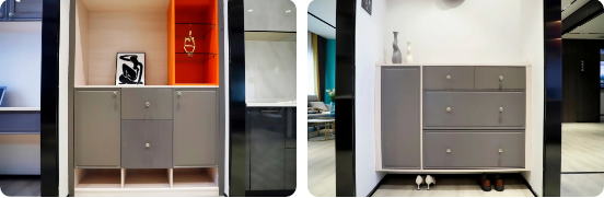 現(xiàn)代簡(jiǎn)約風(fēng)格系列之榻榻米、入戶柜、鞋柜等呈現(xiàn),無(wú)論是板材花色搭配上還是點(diǎn)綴色的運(yùn)用上都相得益彰,給人親切的家居溫馨感的同時(shí)又極具質(zhì)感,完美的將品牌“健康·時(shí)尚·品質(zhì)·品味”的產(chǎn)品理念極致體現(xiàn)。