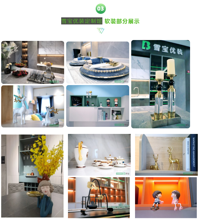 雪寶優(yōu)裝定制館在硬裝方面的表現(xiàn)已然精彩紛呈,無(wú)論是精湛的技術(shù)工藝呈現(xiàn)出藝術(shù)的產(chǎn)品,亦或細(xì)節(jié)處的精雕細(xì)琢,無(wú)不體現(xiàn)出雪寶人的匠心匠材。在軟裝搭配方面更是相得益彰,恰到好處。