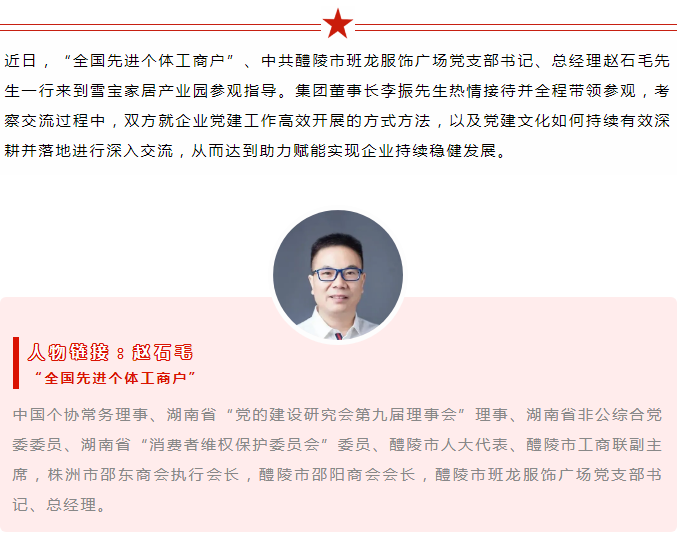 作為其他企業(yè)和政府單位爭(zhēng)相學(xué)習(xí)黨建工作的對(duì)象。因緣際會(huì),在2020年11月,集團(tuán)董事長(zhǎng)李振先生攜部分高管走進(jìn)趙石毛先生旗下門店“班龍服飾廣場(chǎng)店”參觀學(xué)習(xí)并深入交流黨建文化落實(shí)企業(yè)發(fā)展方面的有效舉措等;