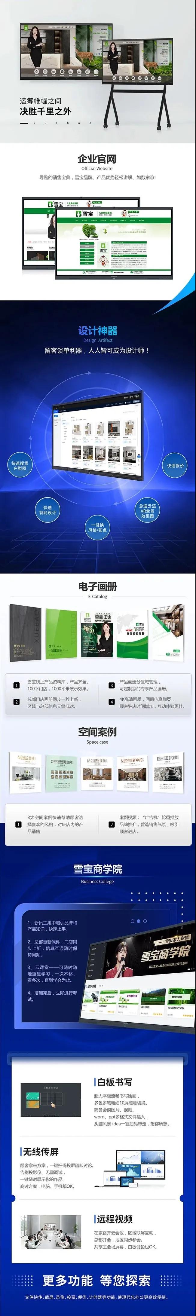 如今有了雪寶智慧云屏的門店,不僅能在有限的實體空間中展示無限的產(chǎn)品,還能讓消費(fèi)者從“被動挑選產(chǎn)品”變?yōu)槟軌蛑鲃尤⑴c、體驗和互動,真正實現(xiàn)全方位面提升顧客入店體驗。另外除了“全景圖”功能以外,雪寶智慧云屏還有其他功能為全國各門店賦能,提高門店銷售業(yè)績: