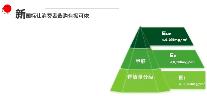 ★ 該標(biāo)準(zhǔn)將室內(nèi)用人造板及其制品的甲醛釋放量按照限量值分為3個等級,即E1級(≤0.124mg/m³)、E0級(≤0.050mg/m³)和ENF級(≤0.025mg/m³)。