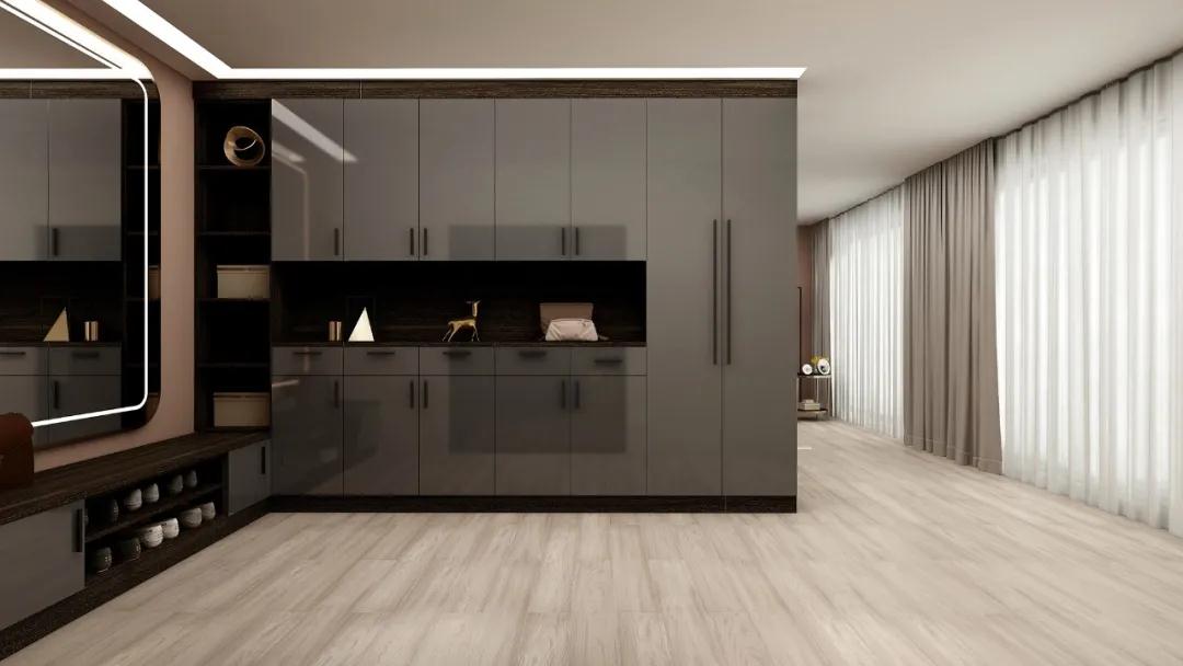與生俱來的輕奢高級(jí)感!雪寶PET門板有時(shí)尚高光板和膚感啞光板兩大品類。高光板表面光潔平整,具有鏡面效果,給人以明亮華麗的感覺,對(duì)光線的反射可以使整個(gè)家居環(huán)境更加清爽明凈。啞光的PET板材常常被稱作膚感膜、抗指紋膜,摸上去如嬰兒肌膚般柔軟,非常適合在衣柜中使用。