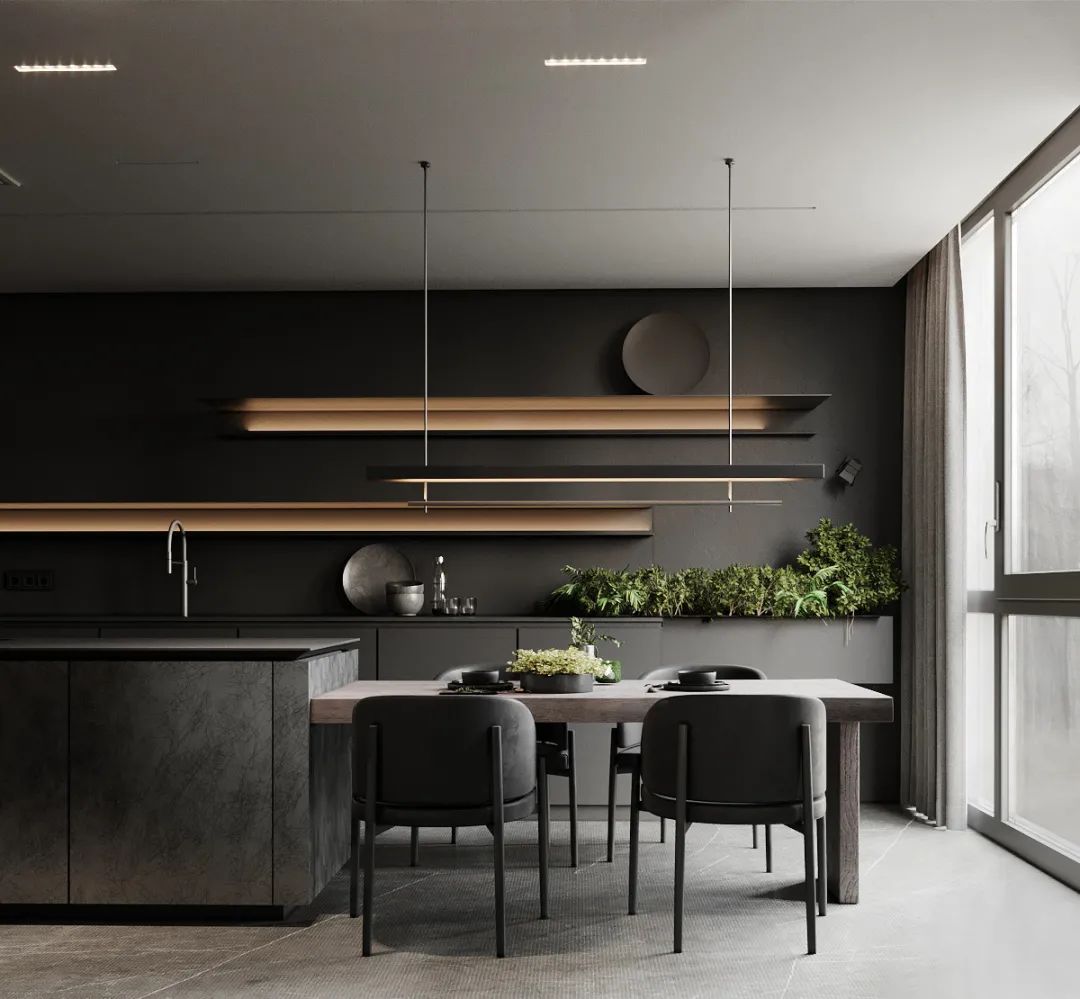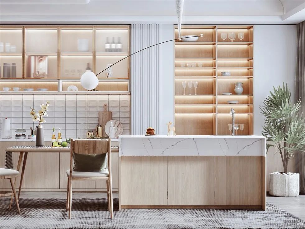靠廚房設(shè)計(jì)為大理石或巖板,另外一邊設(shè)計(jì)為餐桌,這種設(shè)計(jì)動(dòng)線也十分流暢。大理石或巖板可以放洗好的菜和碗碟,另一邊可直接吃飯,這種空間少了隔墻隔斷,也會顯得更加開闊明亮。