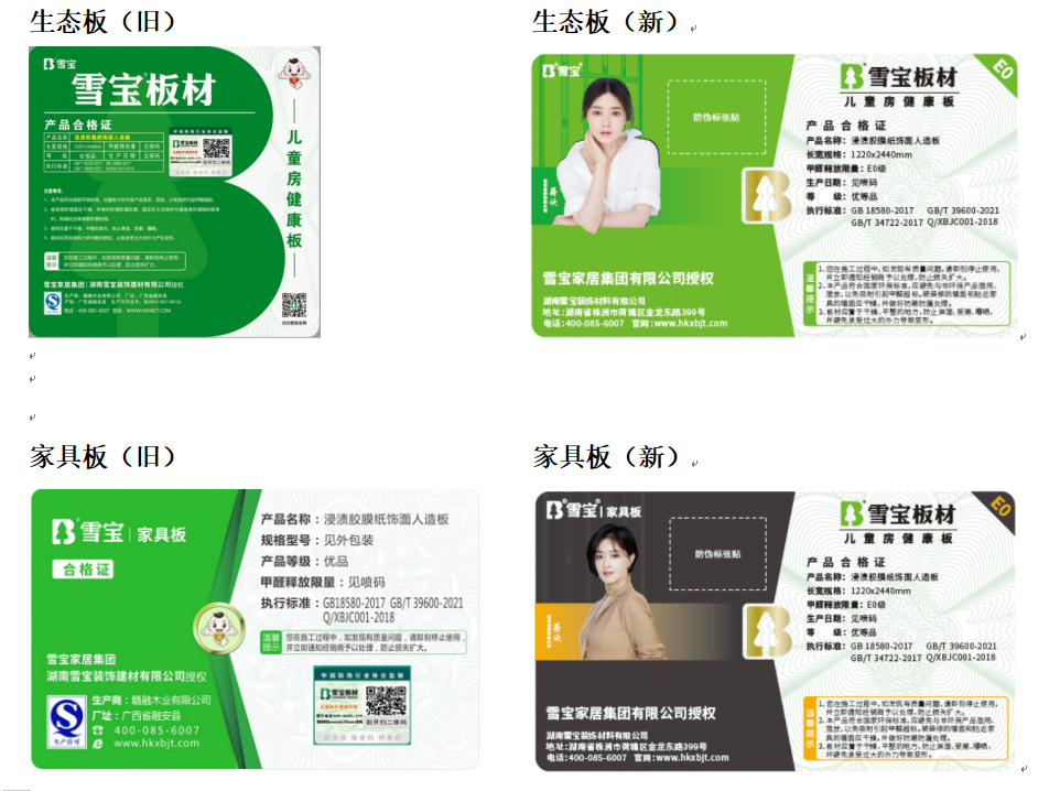 因合格證種類較多,在此不一一列舉。在新舊款合格證更替期間,將存在一部分新舊合格證共存的貨品,請客戶朋友們認準雪寶板材防偽商標和板材表面熒光水印。無論板材表面粘貼新款或舊款合格證,只要防偽驗證后為真,同時板材表面有熒光水印即為雪寶板材正品。