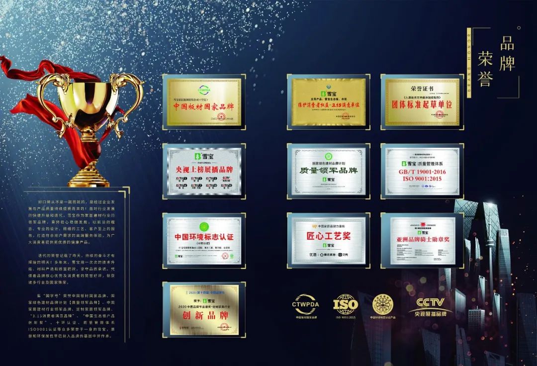 匠心匠材,好板好柜。雪寶憑借著優(yōu)異的產(chǎn)品品質(zhì)和消費(fèi)者的高度好評(píng)以及家喻戶曉的品牌知名度,在眾多板材品牌中脫穎而出,獲得認(rèn)可,榮獲中國(guó)板材行業(yè)影響力“板材十大品牌”、“中國(guó)環(huán)保板材十大品牌”雙項(xiàng)大獎(jiǎng)。