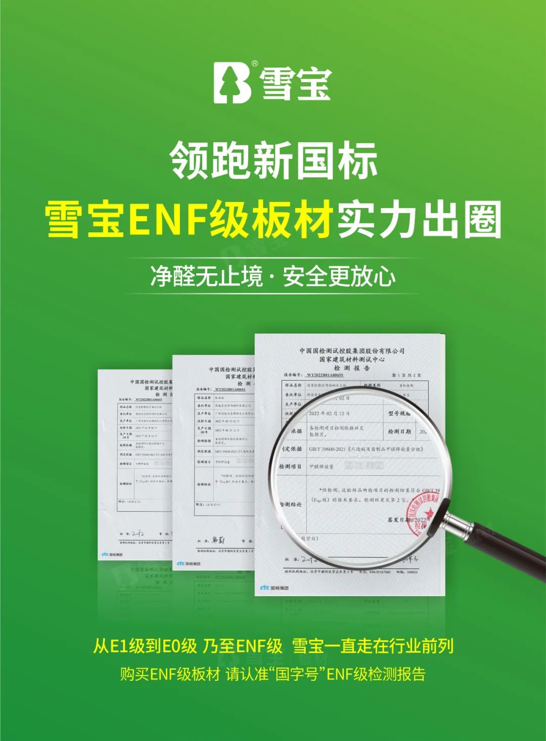 雪寶板材系列產(chǎn)品的甲醛釋放數(shù)值遠(yuǎn)優(yōu)于E0級,甚至比新國標(biāo)ENF級要求的甲醛釋放量≤0.025mg/m³更低。這源于中國國檢測試控股集團(tuán)的國家建筑材料測試中心檢測出具的檢測報(bào)告就是最有力的證明。消費(fèi)者在購買ENF級板材時(shí),務(wù)必認(rèn)準(zhǔn)“國字號”ENF級檢測報(bào)告。