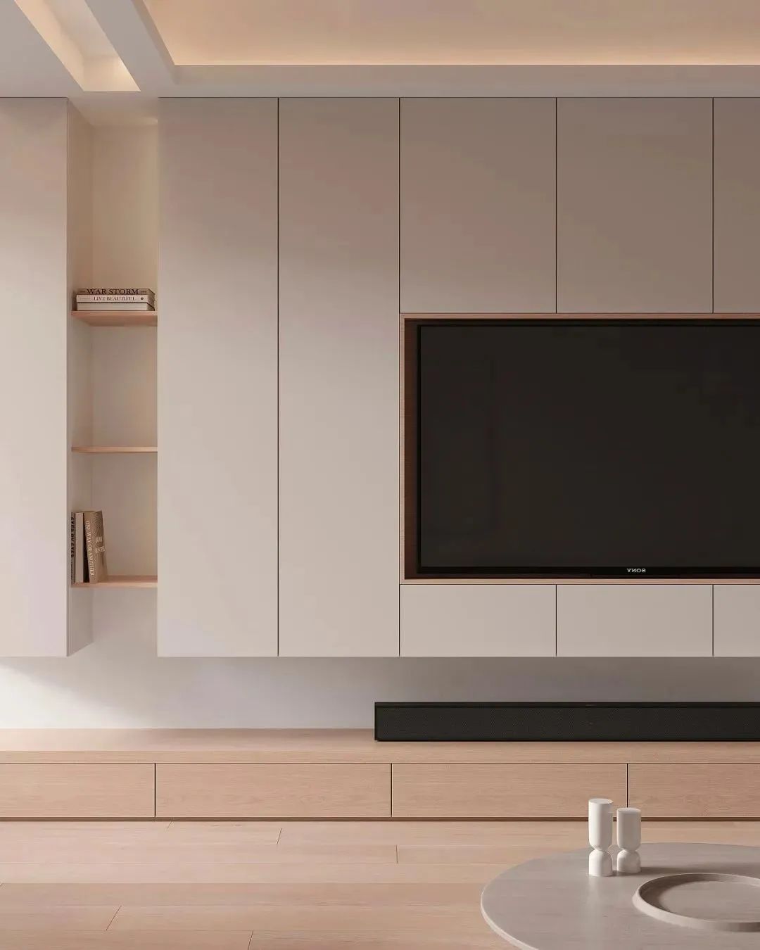 材質(zhì)方面為了符合奶油系風格的調(diào)性,材質(zhì)上要選擇比較有肌理感的,像羔羊絨、棉麻、原木等材質(zhì)都很合適。