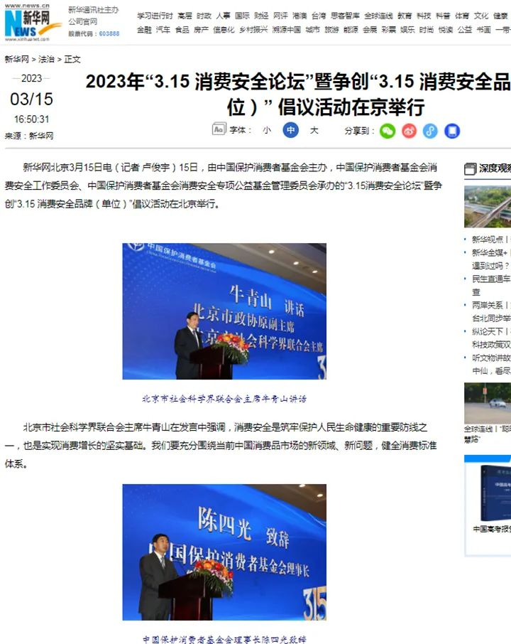 2023年3月15日,由中國保護消費者基金會主辦,中國保護消費者基金會消費安全工作委員會、中國保護消費者基金會消費安全專項公益基金管理委員會承辦的“3.15消費安全論壇”暨爭創(chuàng)“3.15 消費安全品牌(單位)”倡議活動在北京舉行。雪寶受邀出席,并被授予“爭創(chuàng)3•15消費安全品牌承諾單位”!