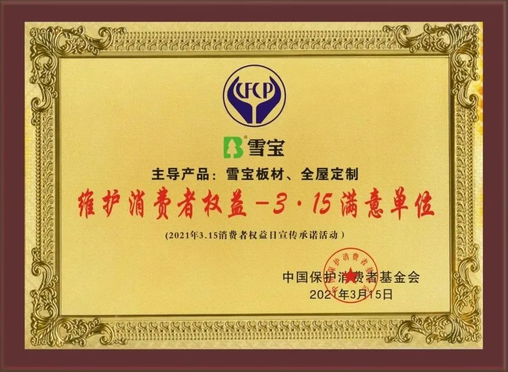 經(jīng)過多輪嚴格的評審與篩選,雪寶家居集團有限公司主導產(chǎn)品雪寶板材、全屋定制品類以優(yōu)異的產(chǎn)品品質(zhì)和良好的消費口碑,被中國保護消費者基金會授予“爭創(chuàng)3•15消費安全品牌承諾單位”!