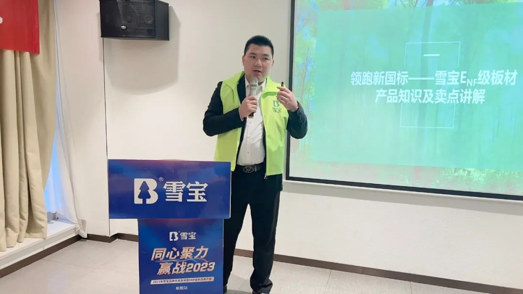 會上,雪寶華北生態(tài)板事業(yè)部區(qū)域負(fù)責(zé)人曹廣飛先生現(xiàn)場詳細(xì)解讀雪寶ENF級板材產(chǎn)品知識及核心賣點(diǎn)。