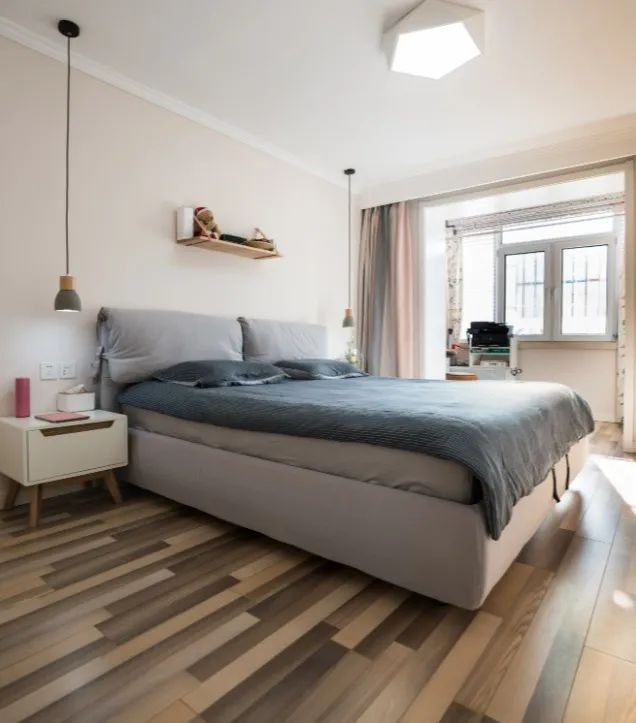 色彩是以沉穩(wěn)、溫馨為主,比如:原木色或淺灰色為主調(diào),讓臥室顯得安穩(wěn)寧靜。不過,正對床的玻璃柜門要慎裝,半夜容易反光嚇到人,而且隔三差五就需要收拾,不然會(huì)很亂。