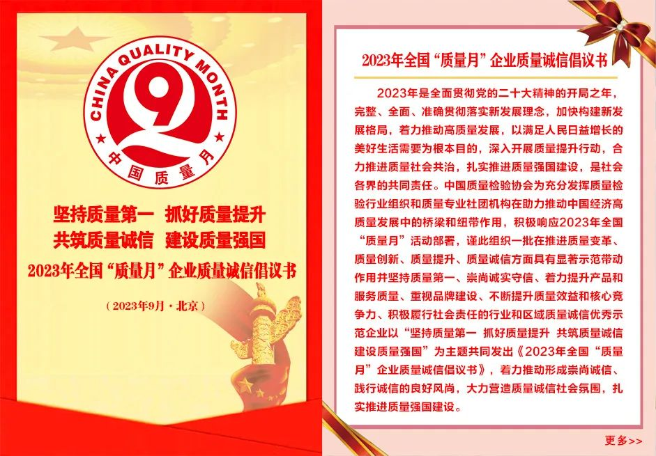 中國“質量月”活動始于1978年,是在我國政府相關主管部門的倡導和部署下,以多種形式于每年的9月在全國范圍內(nèi)動員全社會尤其是廣大企業(yè)積極參與,長期組織開展的一項重大質量活動和群眾性質量主題活動。全國“質量月”活動旨在提高全民質量意識,營造人人關心質量、重視質量、追求質量、創(chuàng)造質量、享受質量的良好社會氛圍,提升國家質量競爭力,推進建設質量強國。