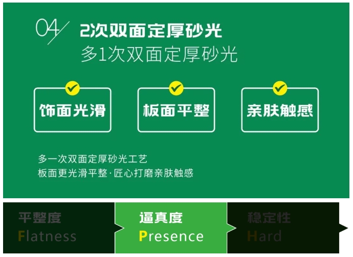 從飾面紙張的耐用性(Durabilityt)、3D印刷技術實木紋理的還原度(Reduction)、鋼板與飾面紙同步精準對紋壓貼的吻合度(Integrating)、2次雙面定厚砂光板面的平整度(Flatness)、4+1色印刷技術的飾面效果逼真度(Presence)、進口艾克洛油墨工藝締造10年色澤如新的穩(wěn)定性(Hard)6個維度創(chuàng)造,100%還原實木紋理。