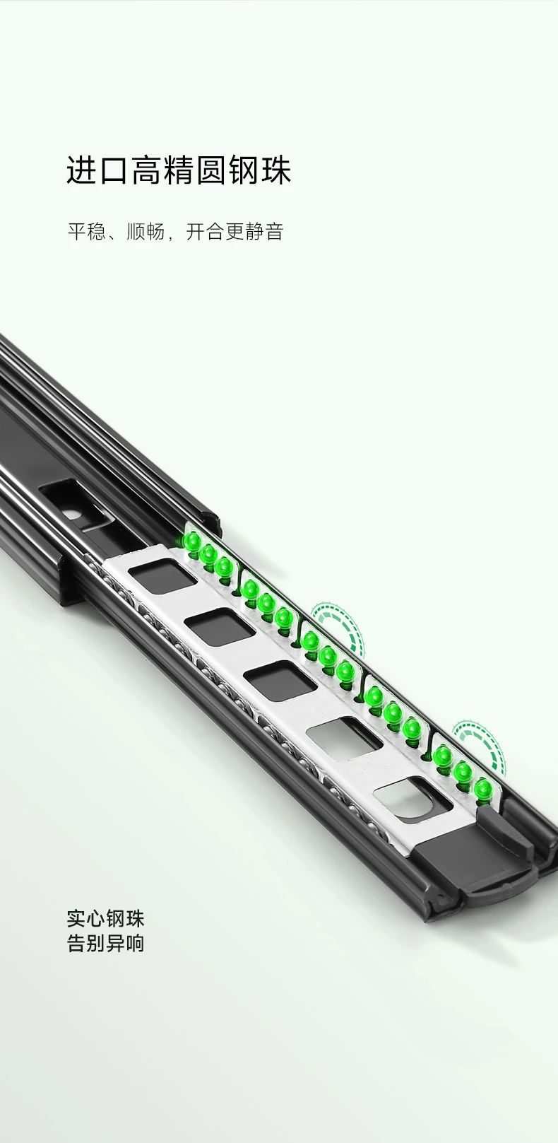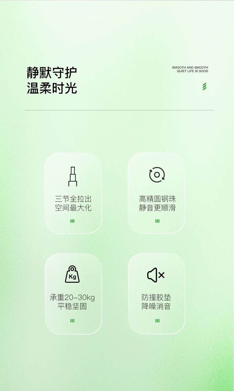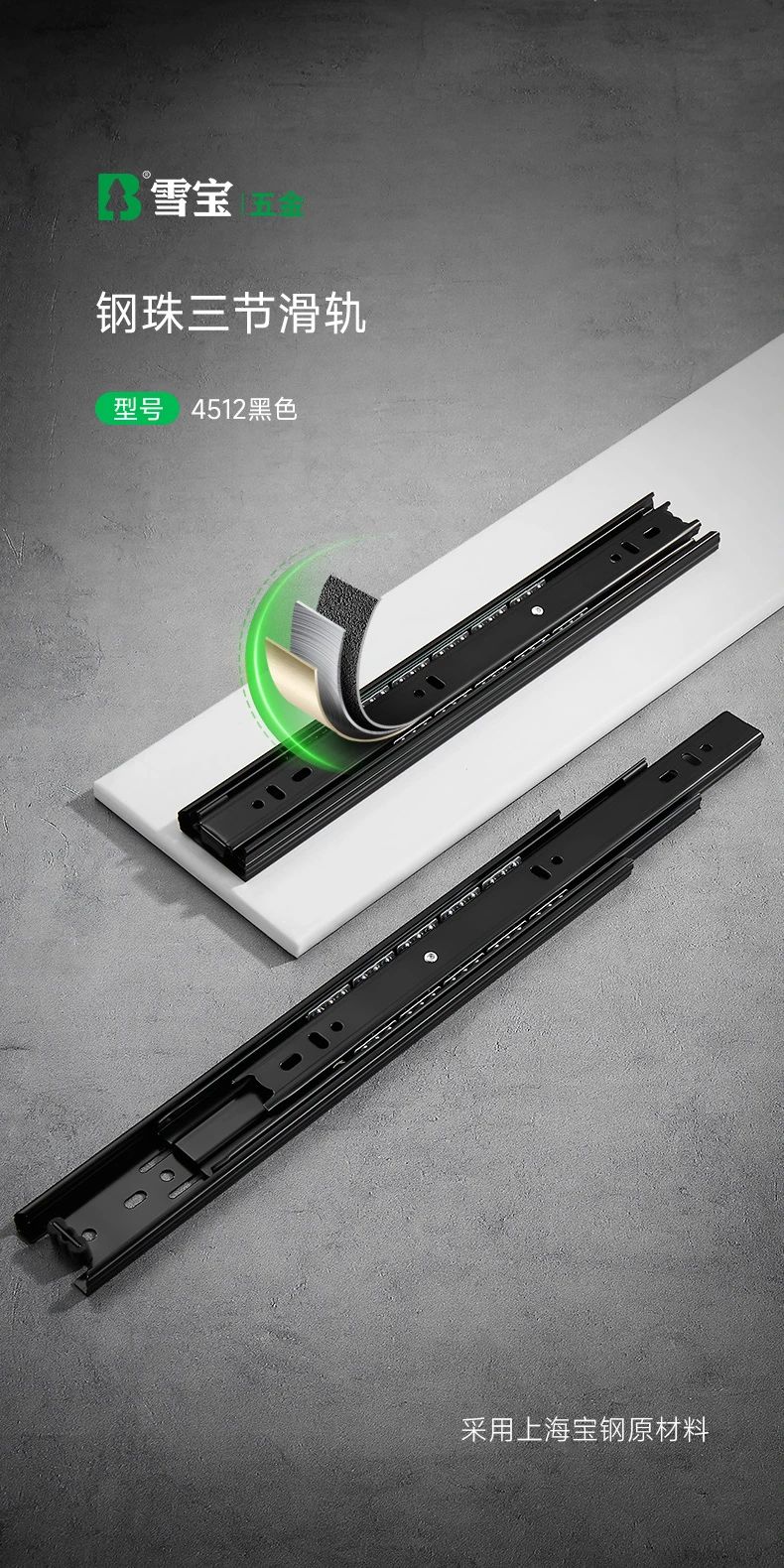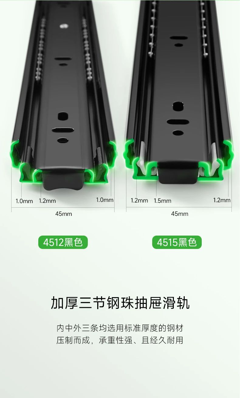 抽屜在家具中的使用很關(guān)鍵,對于抽屜而言,滑軌就是抽屜的“心臟”。于家居收納中有著無與倫比的作用,讓空間在無序中建立有序。而抽屜的使用體驗(yàn),絕大程度上取決于滑軌。開合是否能順滑、能抽拉到什么程度、承重如何、會不會翻傾等問題,都跟滑軌有關(guān)系,因此選擇一個品質(zhì)好的滑軌很重要。雪寶4512黑色鋼珠三節(jié)滑軌,精工設(shè)計,內(nèi)置鋼珠,穩(wěn)定性強(qiáng),全程順滑到底。三節(jié)全拉出設(shè)計,抽屜空間一覽無余,物品收納整齊有序,取物更輕松。表面電鍍工藝,抗腐蝕,耐磨損,久用如新,無需頻繁更換?燎笃焚|(zhì)細(xì)節(jié),讓每一次推拉都是一種享受!