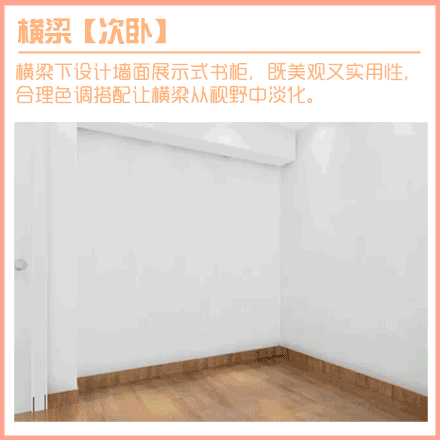【7、柱子·次臥】橫梁下設(shè)計墻面展示式書柜,既美觀又實用性,合理色調(diào)搭配讓橫梁從視野中淡化。