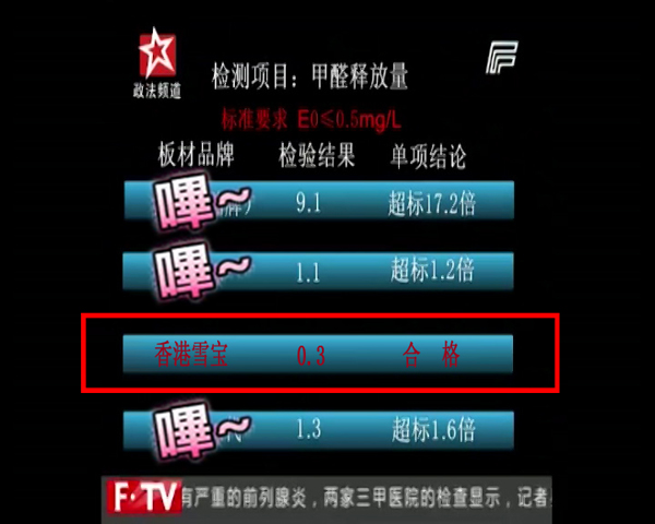 政法頻道3.15期間特別節(jié)目《陽光下的315》中,記者暗訪了某大型建材市場中的各板材專賣店,也抽取了其中某些品牌產(chǎn)品進行甲醛釋放量檢測,其中雪寶E0級別的板材也被隨機抽查,與其它品牌板材一起接受了檢驗。