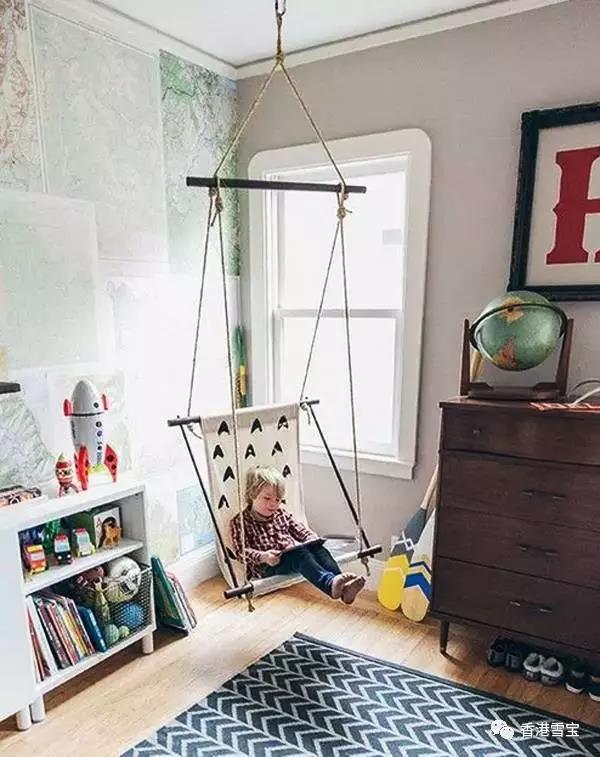 ▲在臥室里裝一個(gè)小吊椅看起來不錯(cuò)。在保證安全的情況下,家庭中適當(dāng)?shù)膴蕵泛拖灿兄谂囵B(yǎng)孩子活潑開朗的個(gè)性。