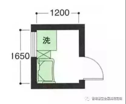 最小尺寸的布局方式,能容納一個800左右的洗面臺、收納柜以及洗衣機。